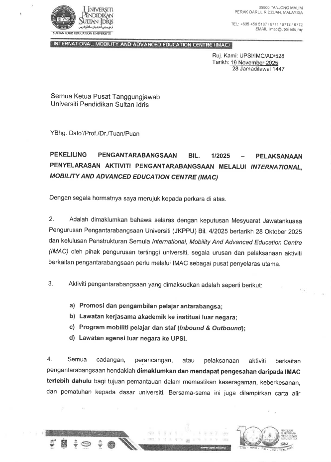 IMAC at UPSI serves as the strategic hub for all things international and mobility-oriented at the university. For students (especially international students), the centre is the main point of contact for visas, mobility, integration and cross-cultural programmes. For partner institutions, it is the doorway to collaborate with UPSI globally.