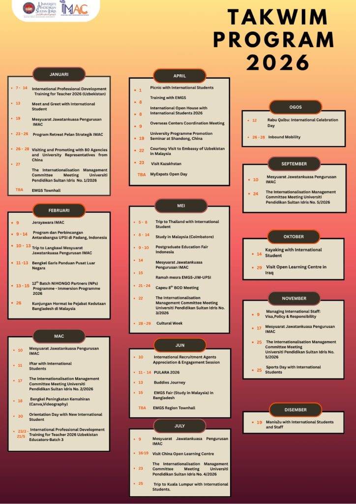 IMAC (International, Mobility and Advanced Education Centre) at UPSI is the centre responsible for internationalization, student mobility (both inbound and outbound), advanced education initiatives and services to international students and partnerships.